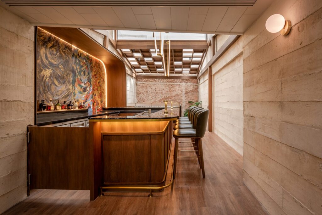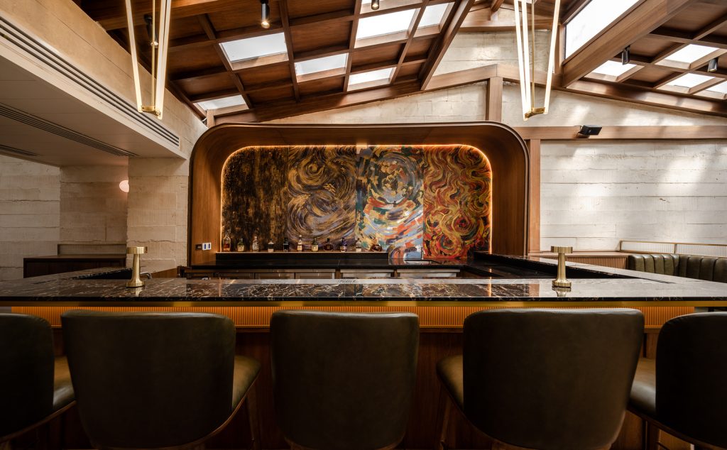 The Bangkok restaurant’s kitchen is located right in the middle of the first floor, while the second floor houses a bar that unwraps around a monumental art piece depicting the four elements, commissioned for the space to tell the story behind Mother. This hypnotic, abstract piece of swirling colour blocks finds footing in olive green leather bar stools, brass elements and darker wooden elements.