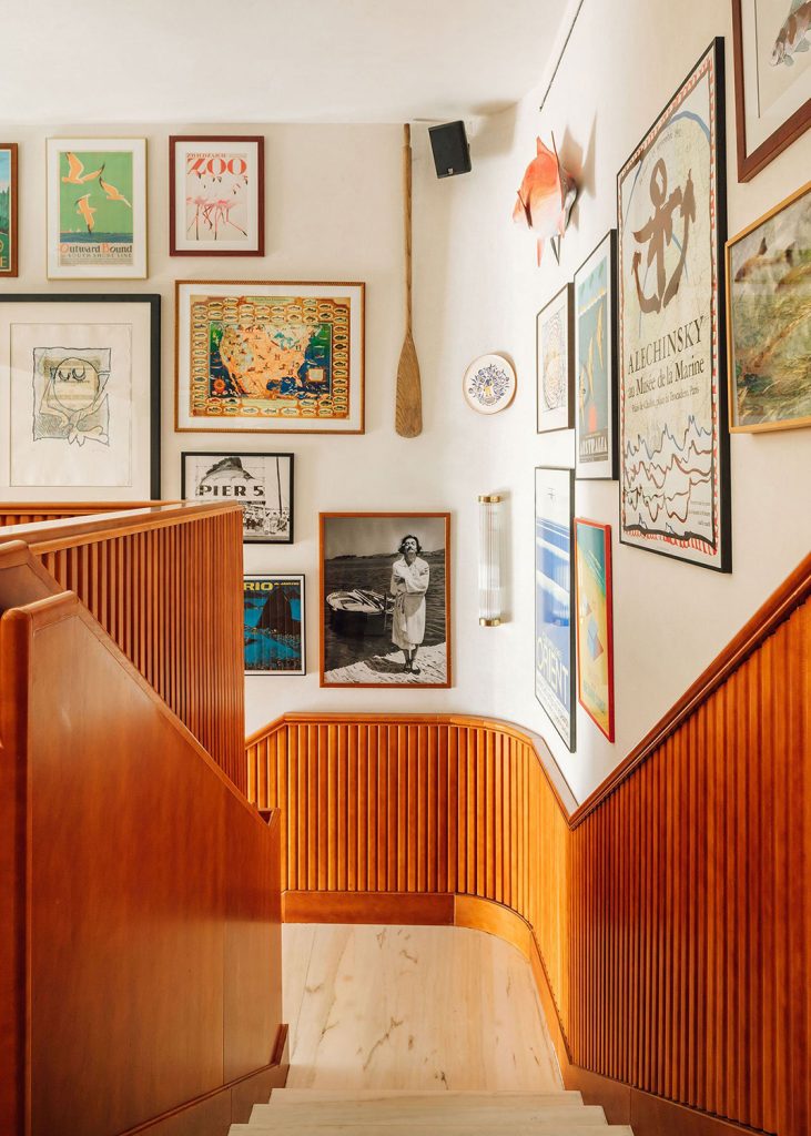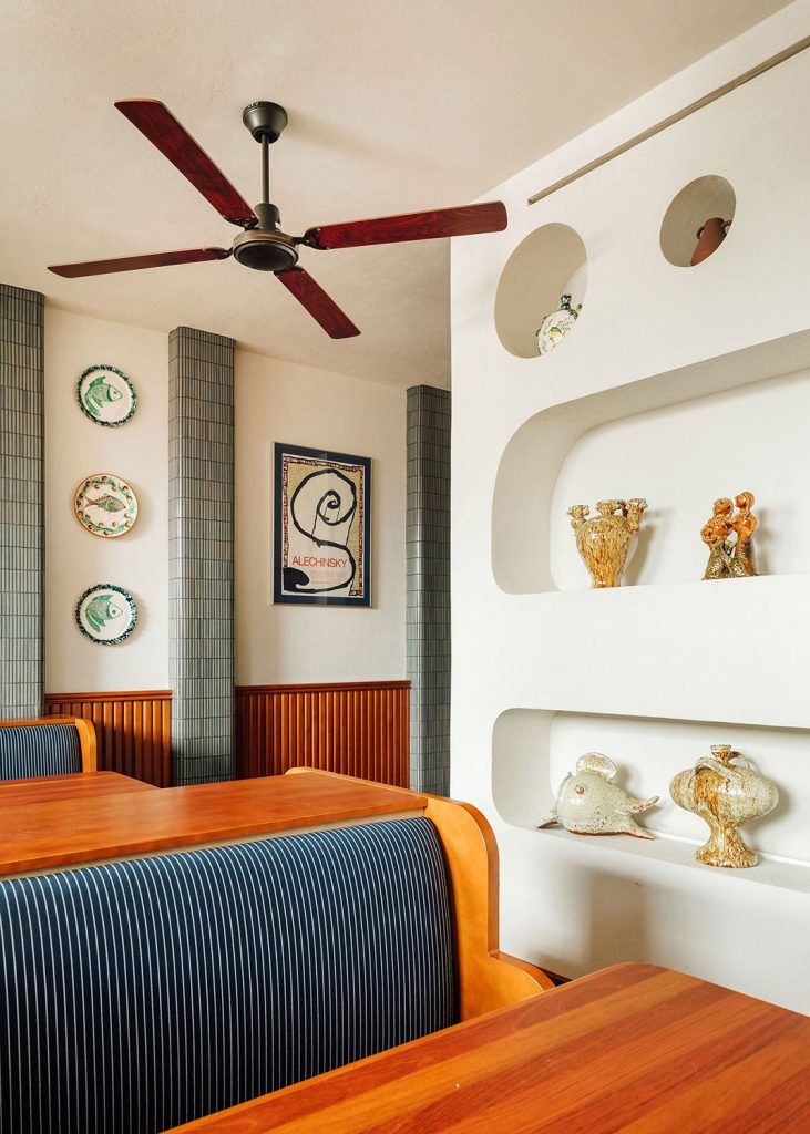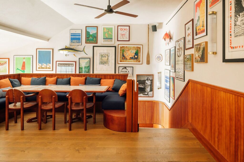Illustrator and ceramicist Henriette Arcelin contributed a hand-painted tile mural, featuring various inhabitants of the sea, and an array of found objects including rattan baskets, oars and painted wooden fish complete the atmosphere.