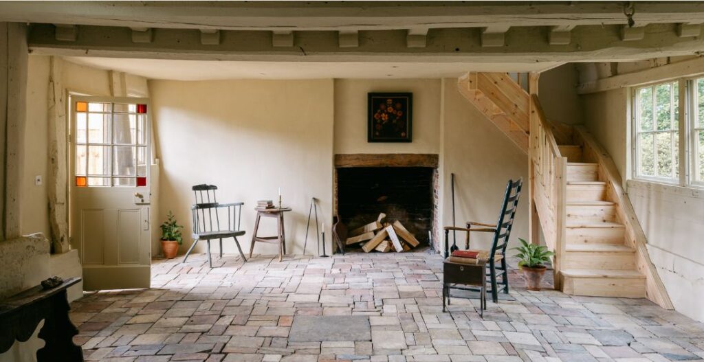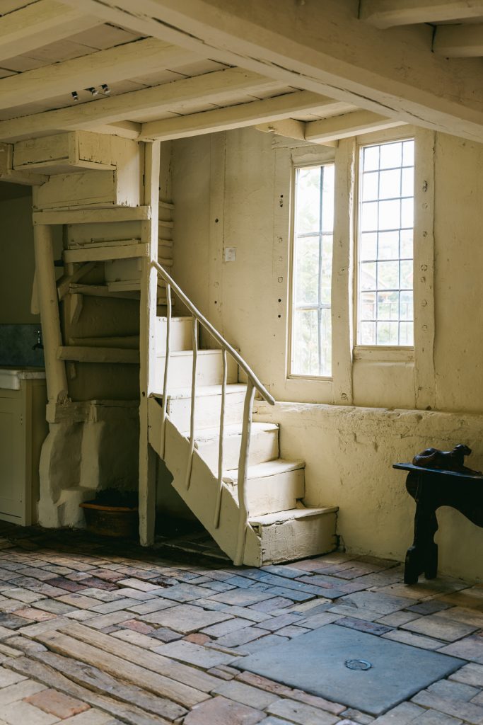 Located in the village of Yoxford, opposite Cockfield Hall, the timber-framed Suffolk property is thought to date from 1592 and has been gently restored by its owners. They’ve peeled back 20th-century interventions to reveal the original structure in all its glory. Plasterboard partitions installed to create smaller rooms and straighten its quirky, crooked walls and ceilings have been removed, and original brick and flagstone floors revealed.