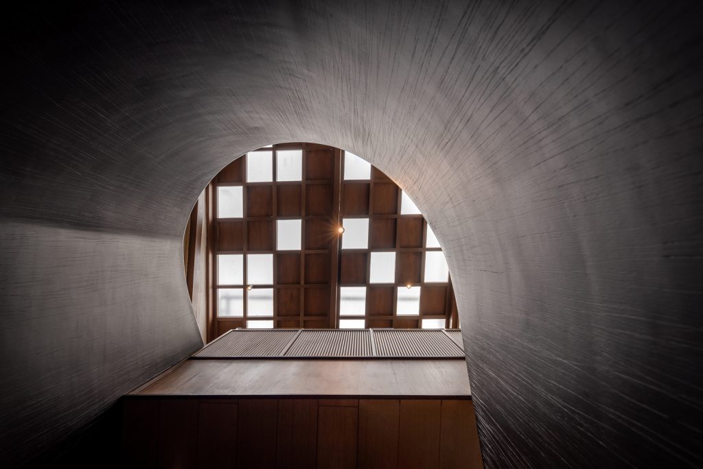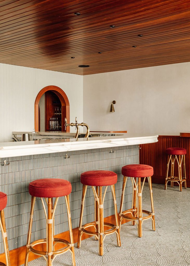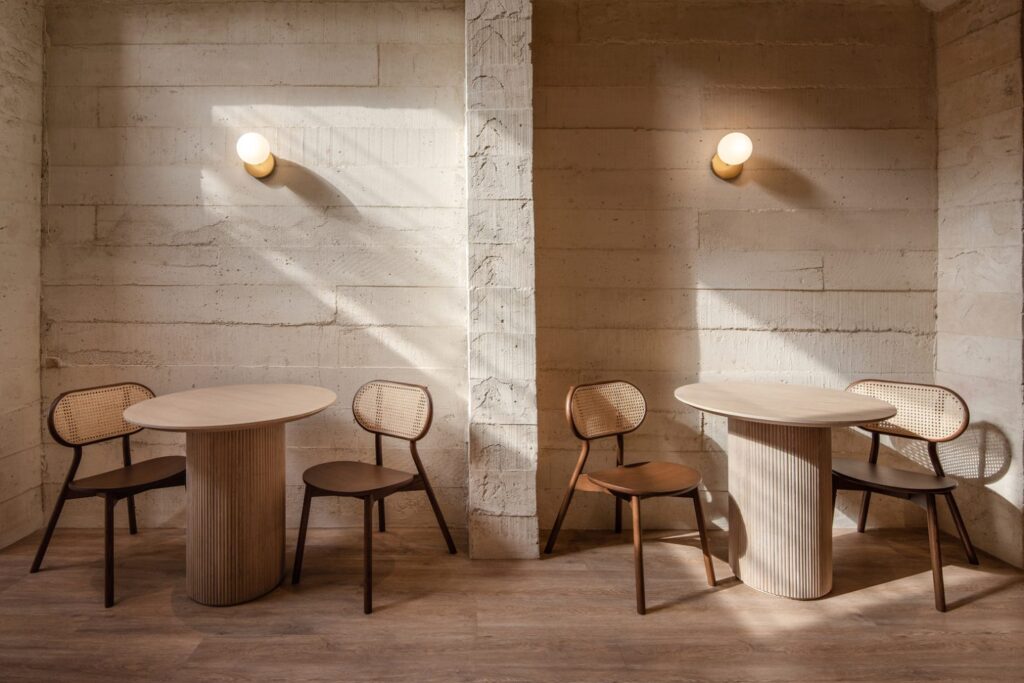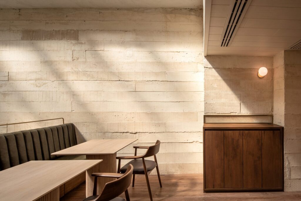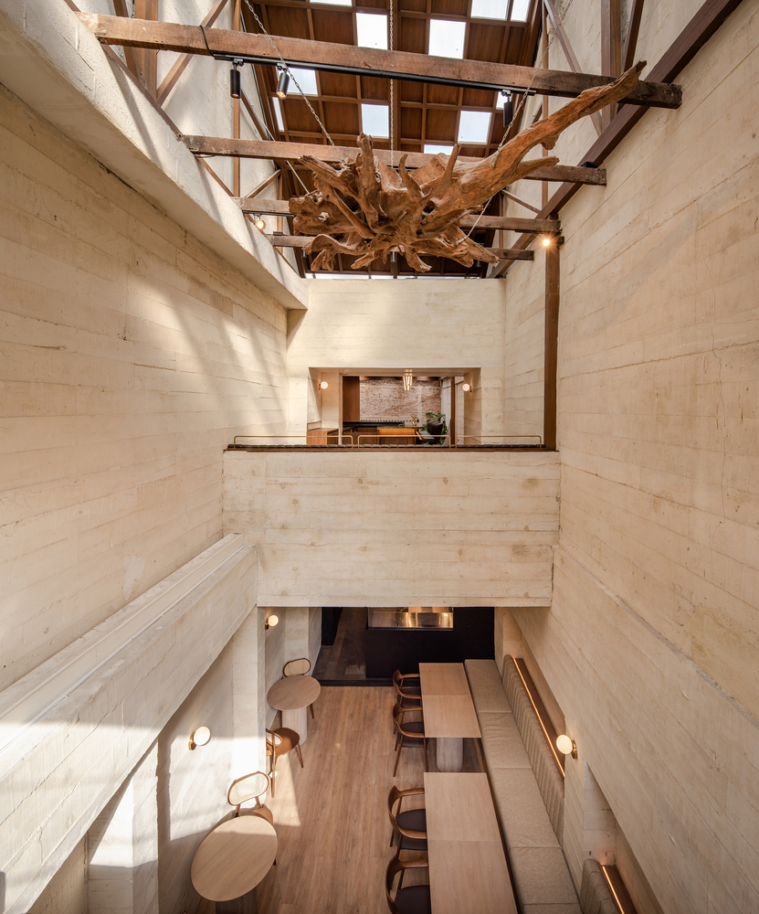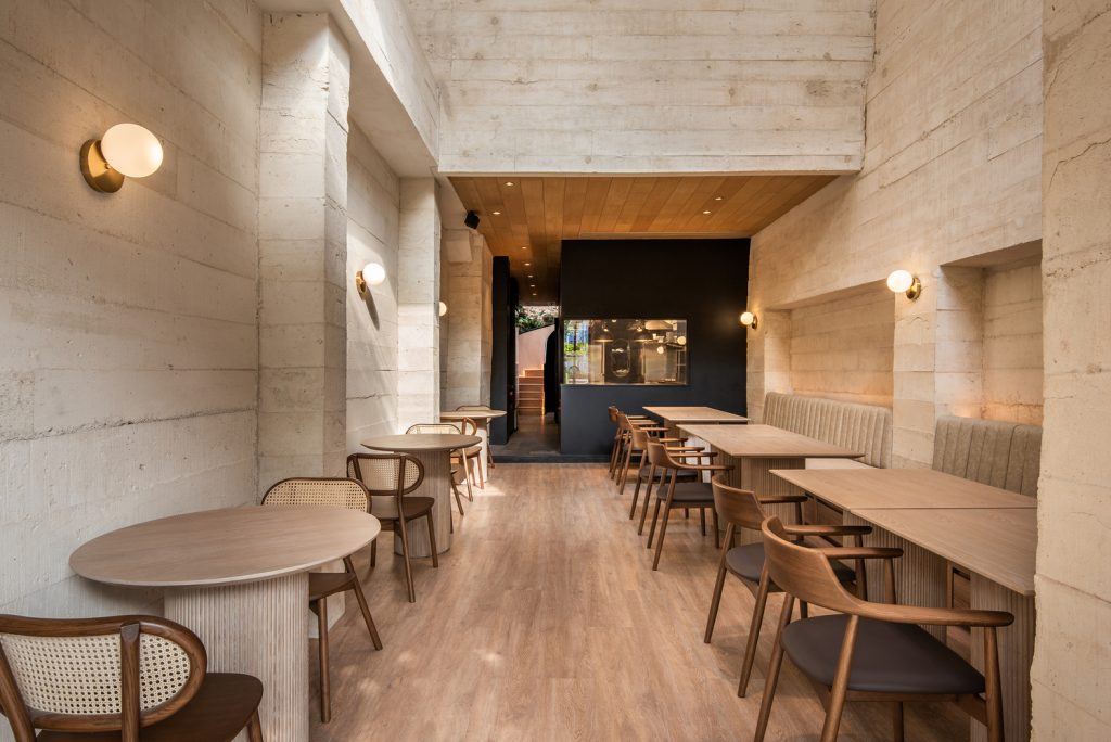 Patrons drift inside a cavernous interior enclosed by clay-coloured stamped concrete walls that evoke the feel of a rustic adobe dwelling with its sun-dried bricks. Crowning the space is a vaulted ceiling, inset with a random arrangement of glass panes and ceiling boards that creates chequerboard shadow-play in the dining space below, where rattan chairs and fluted timber tables are arranged.