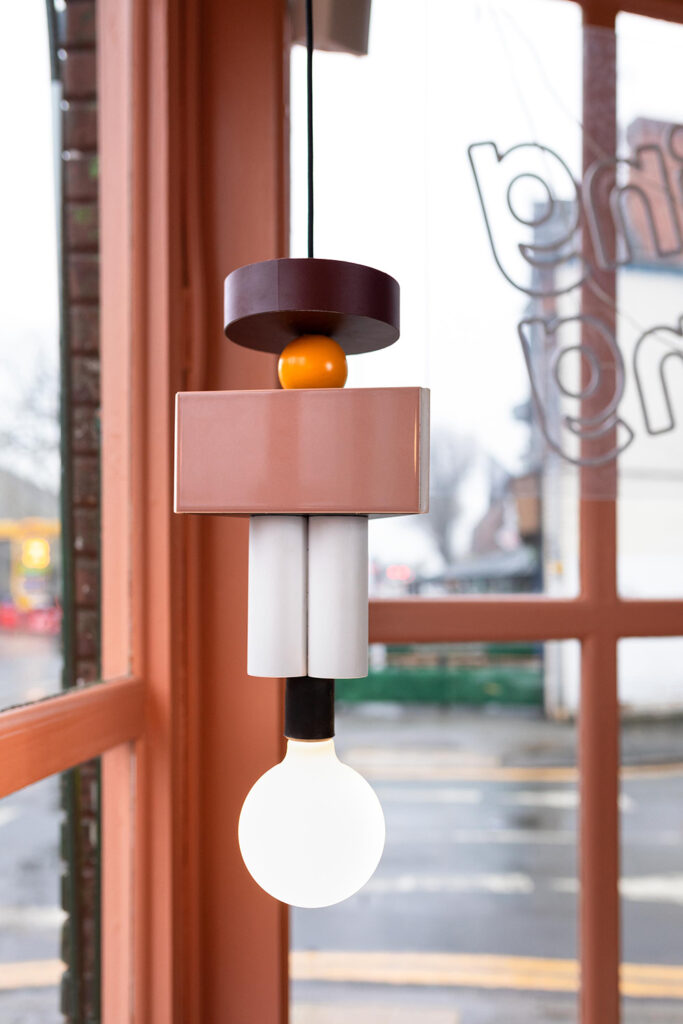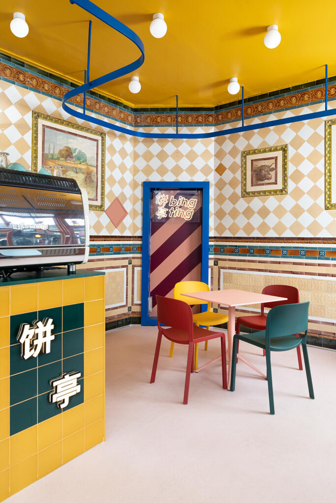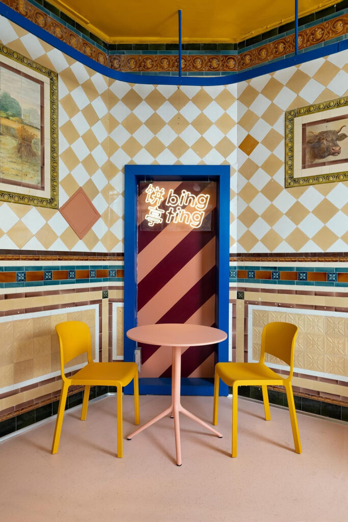 The Bing Ting Cafe takes over a 19th-century butcher’s shop, complete with original, ornate wall and floor tiles – all of which are historically listed and can’t be altered. Buckley leans into this pre-existing fabric to shape his innovations, pulling colours from the Victorian tiling and stained glass windows for diamond-shaped tables and jewel-toned chairs.