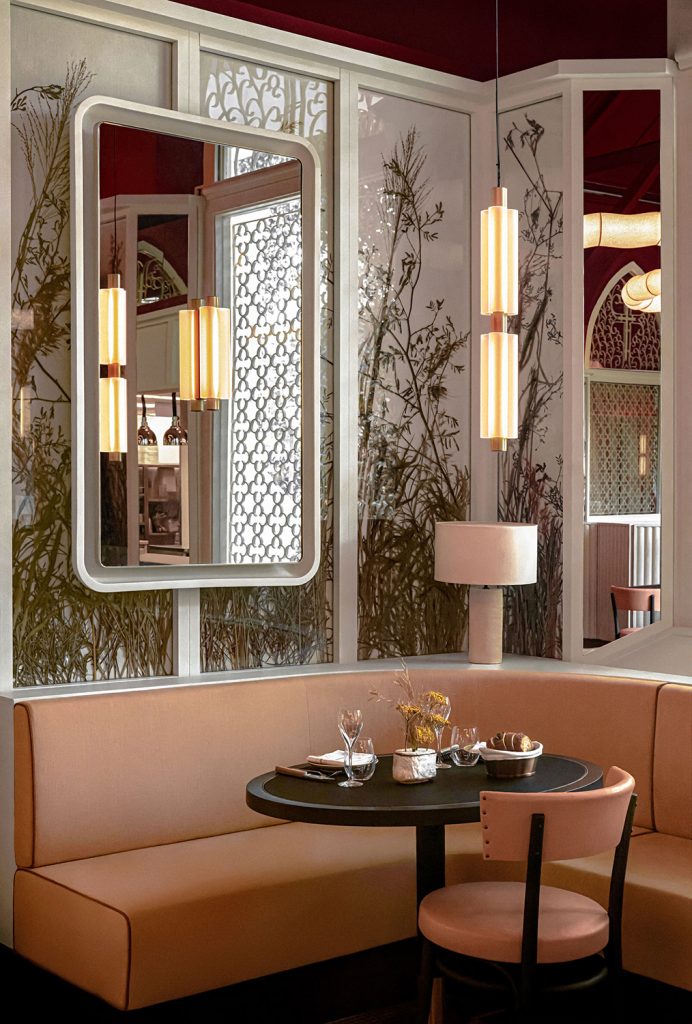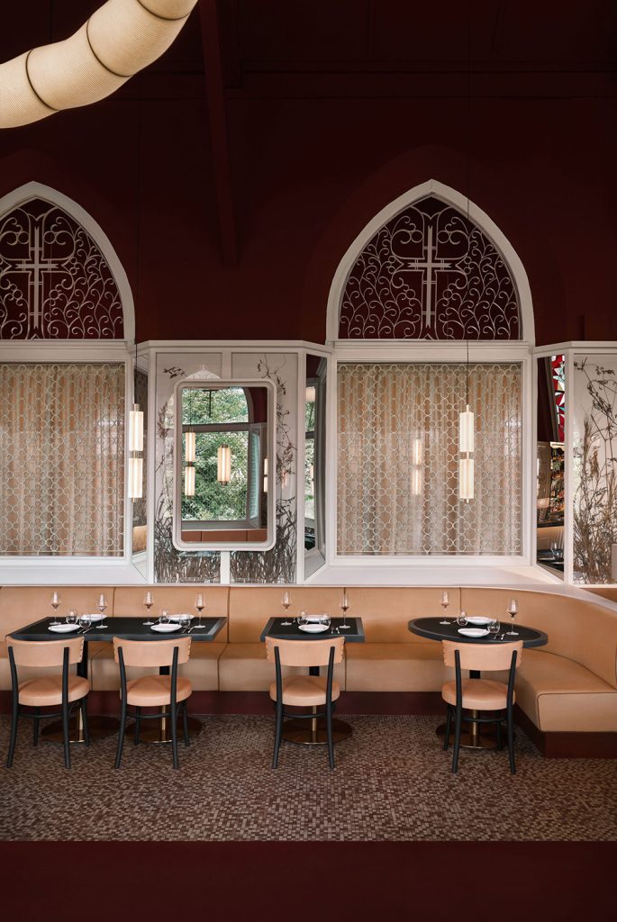 Guests sit on pink banquettes that line the edges of the former chapel, or in mint green tub chairs and sofas. Bistro-style dining chairs bring back a taste of the classic French brasserie, echoed in Claudine’s menu of onion soup, bouillabaisse, steak flambé and frites.