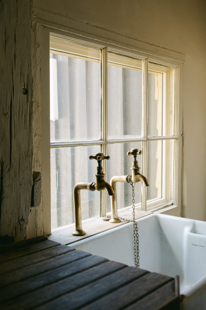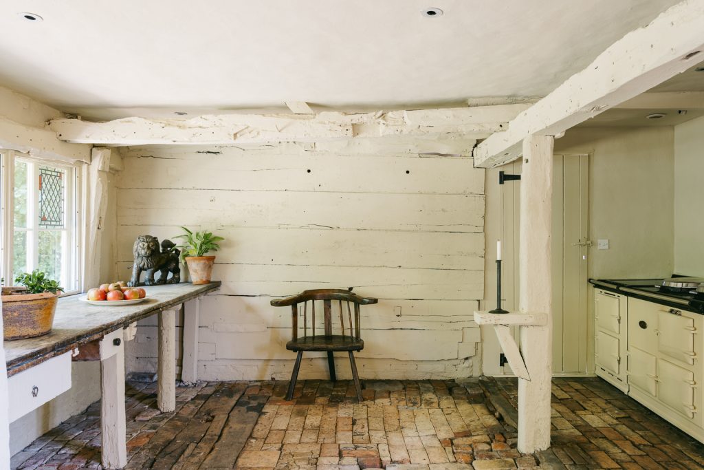 The key space is the kitchen, with its beamed ceilings and white-washed, wood-clad walls. An Aga oven offers a focal point for the space, with other period features inside the 1,100 sq ft dwelling including the original workbench and flooring – an uneven, textured combination of stone slabs, terracotta tiling, brick and English oak.