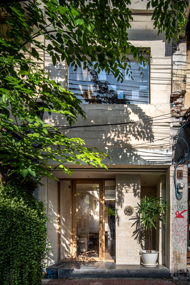 Earthy elements including soil, stone and wood have been used across the two-storey cafe, which takes over a historic building in Bangkok’s Taladnoi neighbourhood, starting with its wood-stamped concrete facade and framed timber entrance.