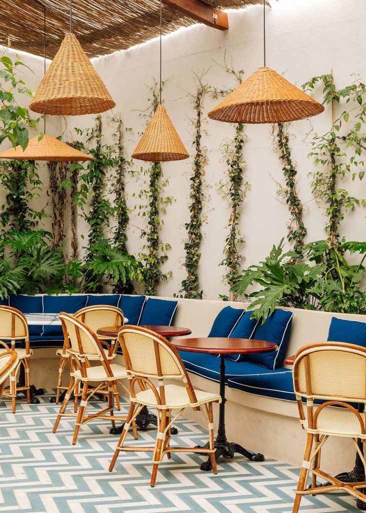 From its marine blue doors and windows to its timber ceilings and striped benches, the Lisbon restaurant embraces all things nautical. Small touches, such as porthole-shaped windows in doors and pieces of vintage advertising all evoke the sea, while more subtle additions – including seats upholstered in wavy, sandy patterns – lend the space a beachy feel.