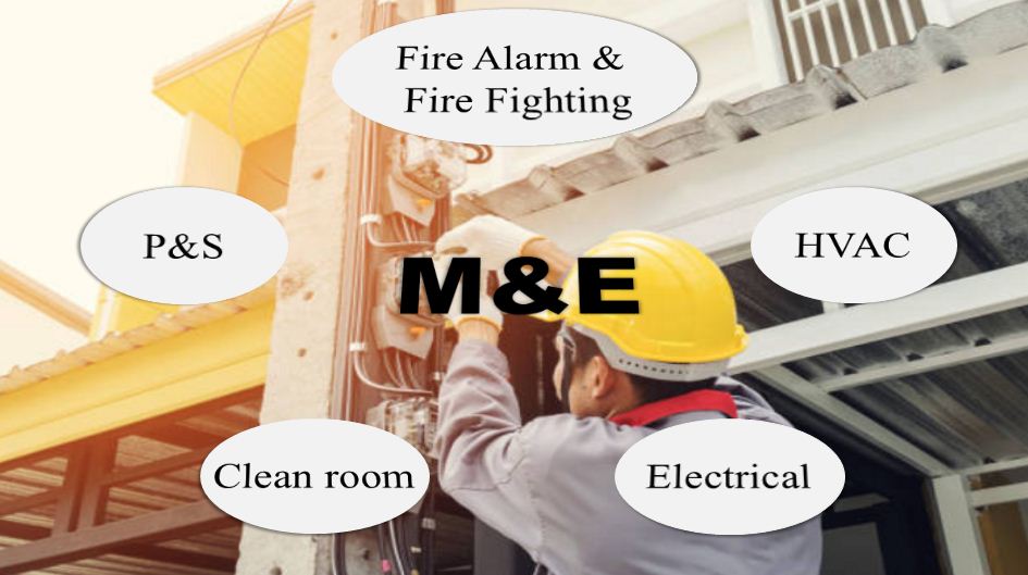 M&E là một hệ thống gồm hai phần, đó là phần điện và phần cơ khí trong hoạt động thi công các công trình. Trong hệ thống đó thì phần điện sẽ chiếm nhiều hơn phần cơ khí khoảng 60%.